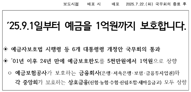 2025년 9월 1일부터 예금자보호 한도액이 기존 5천만 원에서 1억 원으로 상향 적용됩니다.