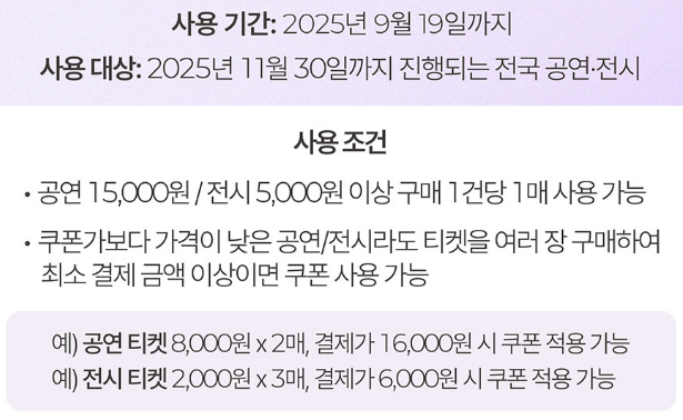 ➤ 조건: 공연 1.5만 원↑, 전시 5천 원↑ 결제 시 적용