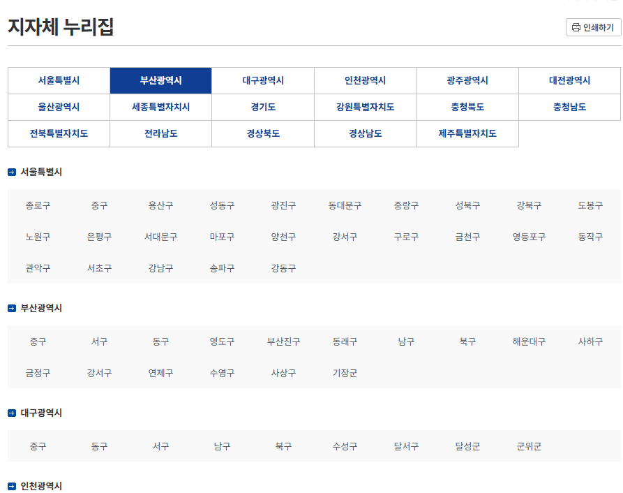 각 지자체 누리집은 서비스 제공 범위와 메뉴 구성이 다르므로 해당 지역 맞춤형 정보 확인이 필요합니다.