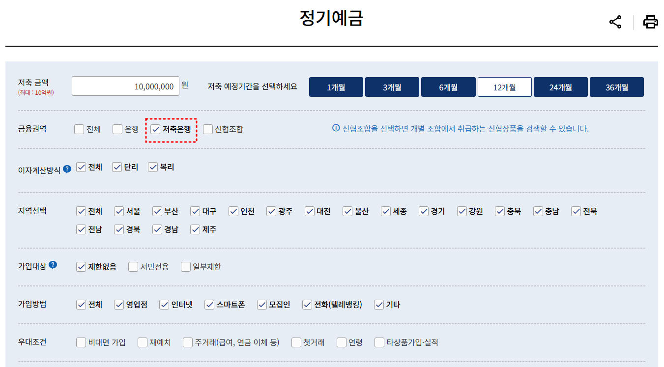그리고 단리와 복리 옵션 선택, 지역 선택, 가입대상과 방법의 다양한 옵션 등을 선택할 수 있어, 본인 취향에 맞는 상품을 손쉽게 찾을 수 있습니다.