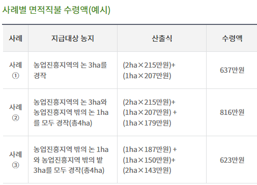 면적에 따른 금액 변동이 큰 만큼, 자신의 농지 구간을 확인해 정확한 직불금 금액을 계산해보시기 바랍니다.