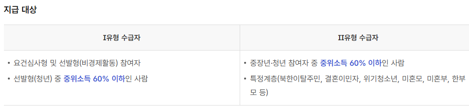 주로 국민취업지원제도 Ⅰ유형 참여자가 주요 지급 대상에 해당합니다.