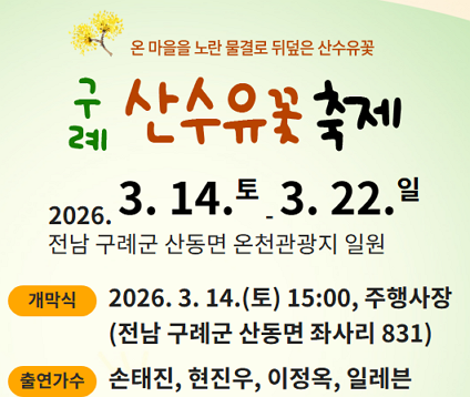 2026 구례 산수유꽃축제는 보통 3월 중순부터 약 9일간 진행되며 지리산 자락 산동면 일대에서 열립니다.