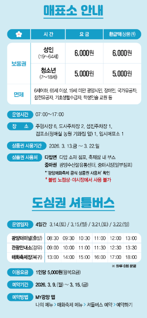 2026 광양매화축제 기간에는 방문객 교통 편의를 위해 주말마다 도심과 매화마을을 연결하는 셔틀버스가 운행됩니다.