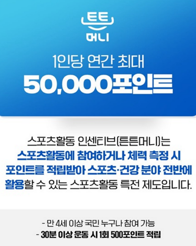 2026 튼튼머니는 국민 건강 증진을 위해 운동 참여 시 포인트를 제공하는 스포츠활동 인센티브 제도로 운영됩니다.