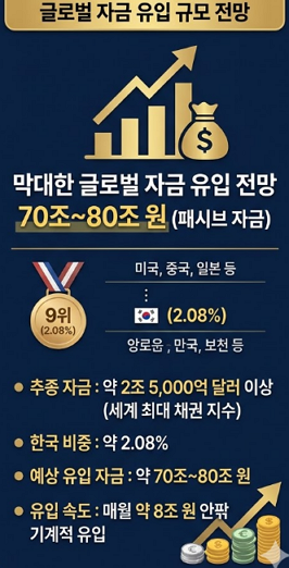 이를 한국의 지수 편입 비중에 대입해 보면 향후 70조 원에서 80조 원에 달하는 막대한 패시브 자금이 유입될 것으로 기대됩니다.