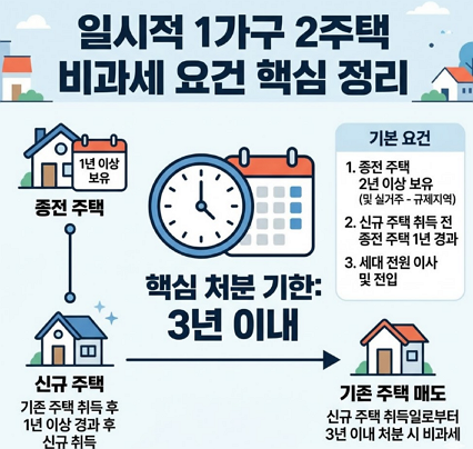 만약 1년이 지나지 않은 시점에서 무리하게 추가 주택을 매입한다면 1가구 2주택 예외 규정을 통한 세금 감면 대상에서 제외될 위험이 큽니다.