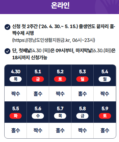 온라인 접수 첫날인 4월 30일에는 출생 연도 끝자리가 짝수인 도민들부터 차례대로 접속하여 원활하게 2026 경상남도 민생지원금 신청을 진행합니다.