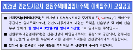 천원주택은 인천시가 저출산 문제 해결과 주거 안정을 위해 신혼부부 및 신생아 가구에게 제공하는 특별한 공공임대주택이에요. 하루 1,000원, 즉 월 3만 원의 저렴한 임대료로 최대 6년까지 거주할 수 있는 기회를 제공하죠. 하지만 모든 사람이 신청할 수 있는 것은 아니며, 정해진 입주 조건과 절차를 충족해야 해요.