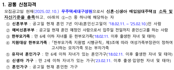천원주택은 신혼부부 및 신생아 가구를 대상으로 한 주거 지원 정책이기 때문에, 기본적으로 신청자는 무주택세대 구성원이면서 아래 조건 중 하나를 충족해야 해요.