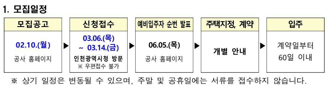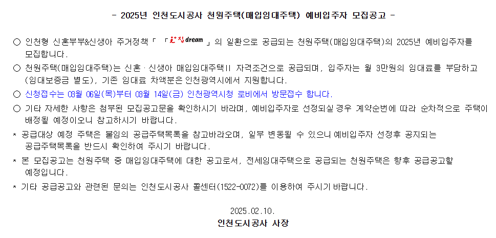 천원주택은 정해진 모집 기간 동안만 신청할 수 있어요. 이번 모집은 2025년 3월 6일(목)부터 3월 14일(금)까지 진행되며, 신청 접수는 인천광역시청 로비에서 방문 접수로만 가능해요.