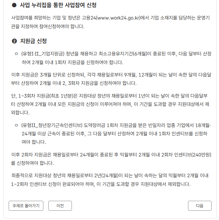 청년 근로자는 별도로 신청할 필요 없이 기업이 신청한 후 진행되는 절차에 맞춰 근무하면 돼요. 하지만 본인이 지원 대상 요건을 충족하는지 미리 확인해 두는 것이 좋겠죠?