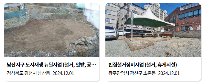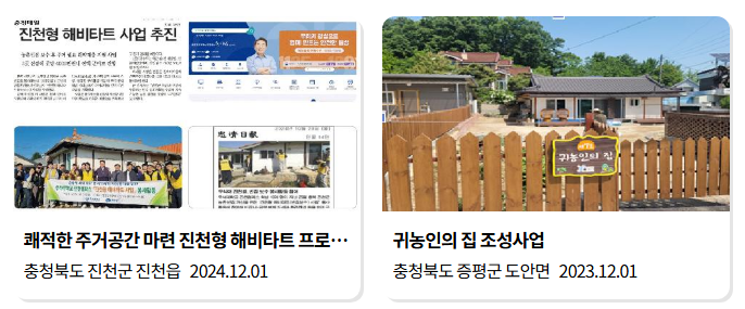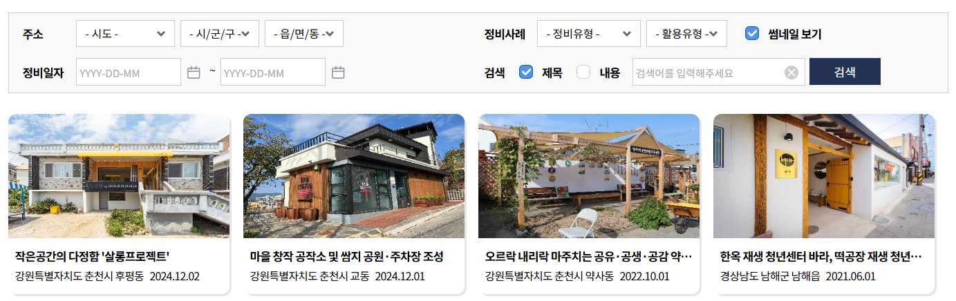 이러한 정보들은 빈집애 누리집에서 유형별로 정리되어 있어, 빈집 활용을 고민하는 사람들에게 실질적인 참고 자료가 될 수 있습니다.