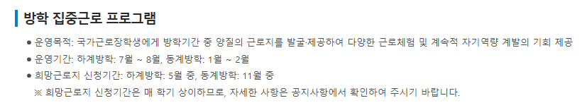 특히 방학 중에는 외부 기관에서 근로할 수 있는 교외 근로가 많아지기 때문에, 보다 다양한 경험을 쌓을 수 있어요.